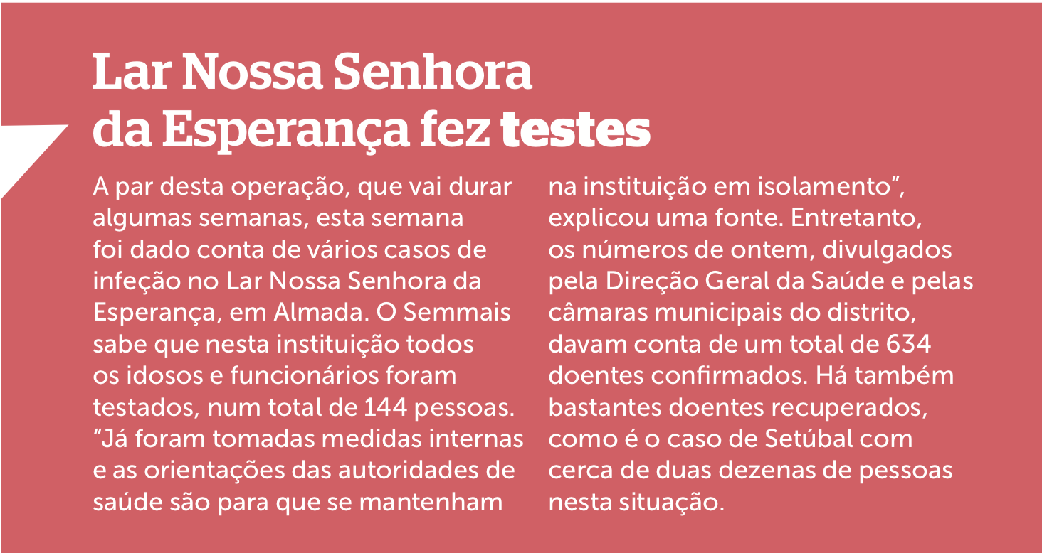 A operação de testagem ao SARS-CoV 19 em todos os lares e residências do distrito arranca esta segunda-feira no concelho de Setúbal, prevendo-se um total de 250 recolhas por dia, no caso da Península. Ontem mesmo, responsáveis do município sadino já tinham realizado visitas aos primeiros oito lares alvo deste programa.