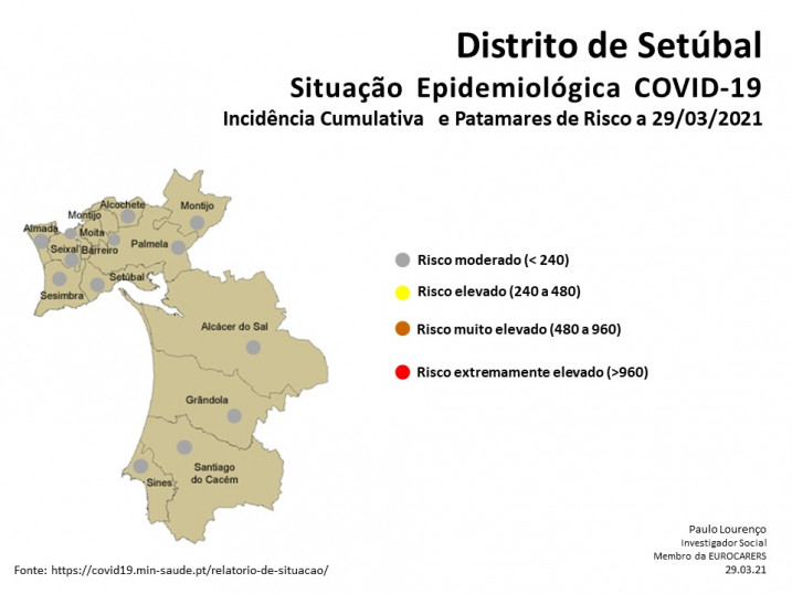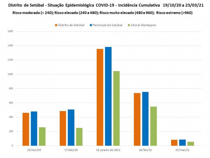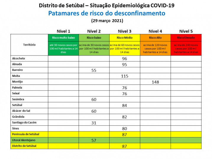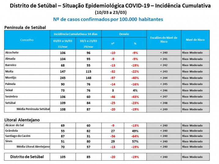 O Distrito de Setúbal mantêm-se no patamar de risco nível 3 (risco médio) com uma média de 85 casos por 100.000 habitantes a 14 dias de IC. O Litoral Alentejano regista uma redução casos, encontrando-se no patamar de risco baixo (nível 2).