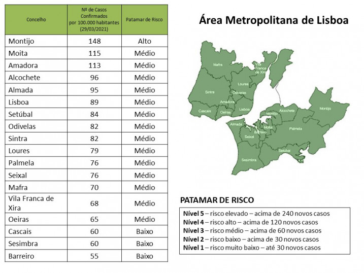 Ao nível do enquadramento dos concelhos do Distrito de Setúbal inseridos na Área Metropolitana de Lisboa, o concelho do Montijo mantém-se na situação de risco elevado com 148 casos por 100.000 habitantes.