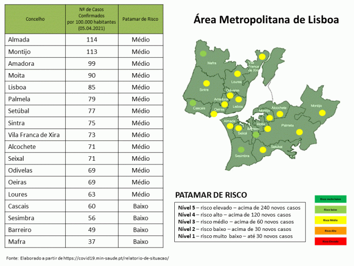 O Distrito de Setúbal mantêm-se no patamar de risco nível 3 (risco médio) com uma média de 80 casos por 100.000 habitantes a 14 dias de IC. O Litoral Alentejano regista a maior redução casos, encontrando-se no patamar de risco baixo (nível 2).