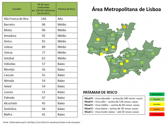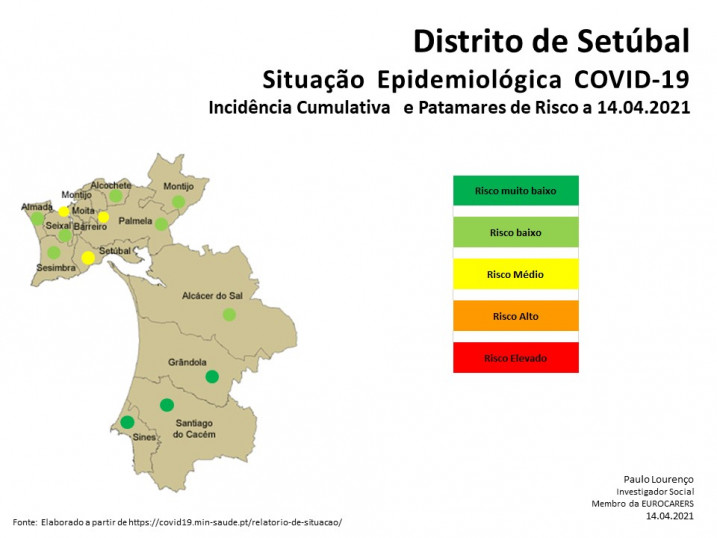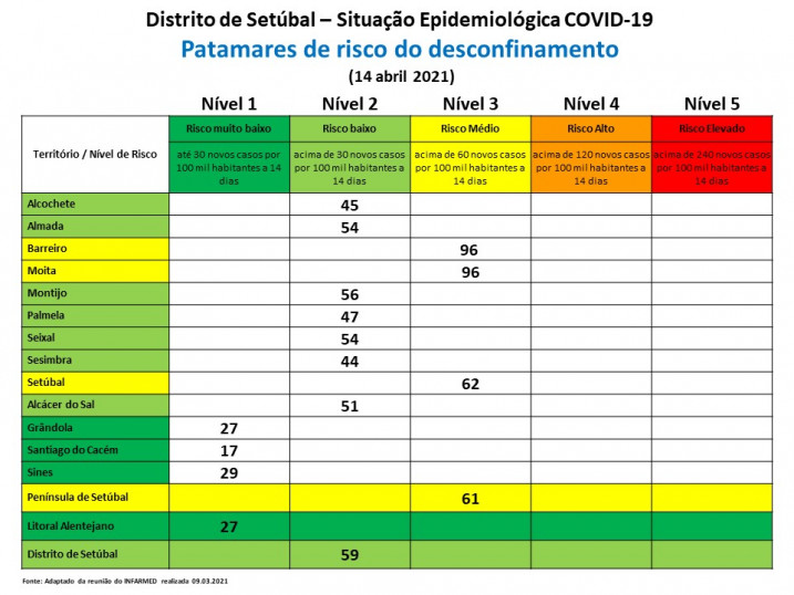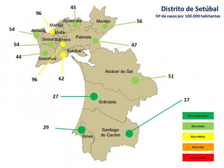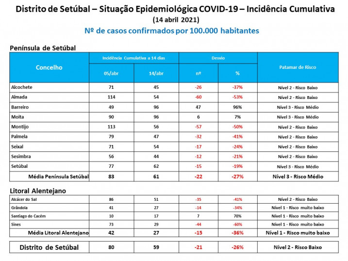 O Distrito de Setúbal encontra-se no patamar de risco nível 2 (risco baixo) com uma média de 59 casos por 100.000 habitantes a 14 dias de IC. O Litoral Alentejano regista a maior redução casos, encontrando-se no patamar de risco muito baixo (nível 1) com uma média de 27 casos. A Península de Setúbal regista o nível médio de risco com 61 casos por 100.000 habitantes.