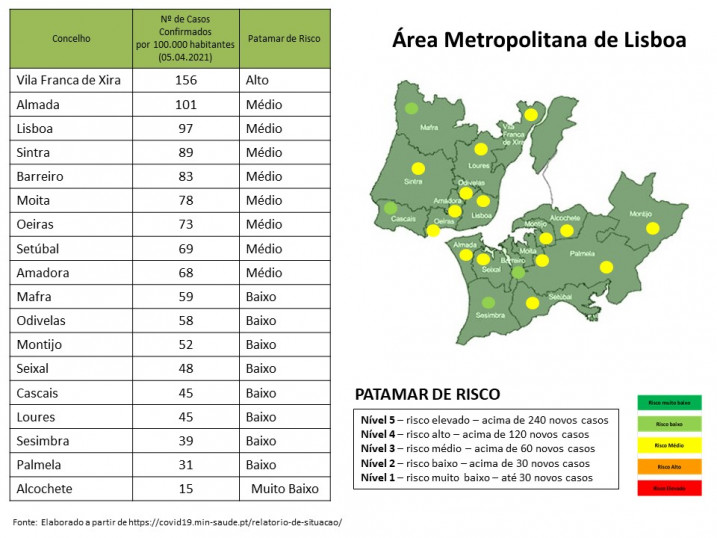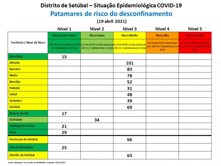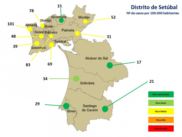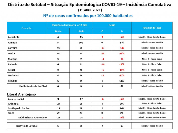 O Distrito de Setúbal mantêm-se no patamar de risco nível 3 (risco médio) com uma média de 63 casos por 100.000 habitantes a 14 dias. O Litoral Alentejano regista a maior redução casos, encontrando-se no patamar de risco muito baixo (nível 1). A Península de Setúbal encontra-se na situação de Risco médio.