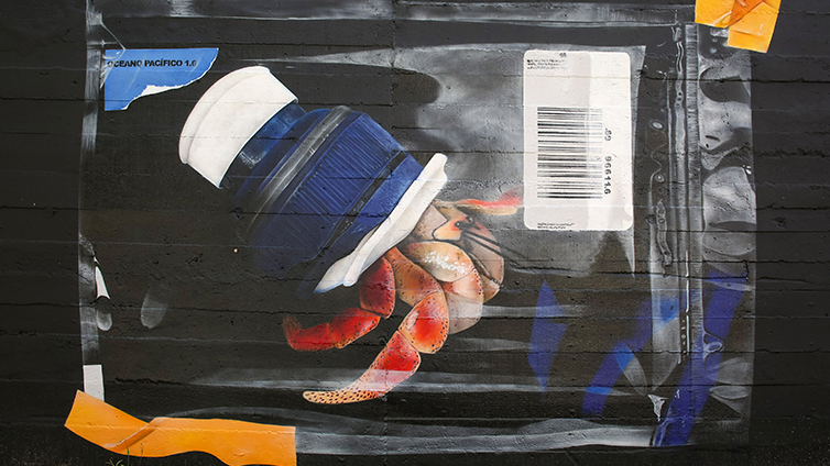 A pintura apresenta um caranguejo ermita envolto em plástico e com um código de barras, de forma a alertar para o uso abusivo de plástico nas embalagens dos produtos consumidos diariamente.